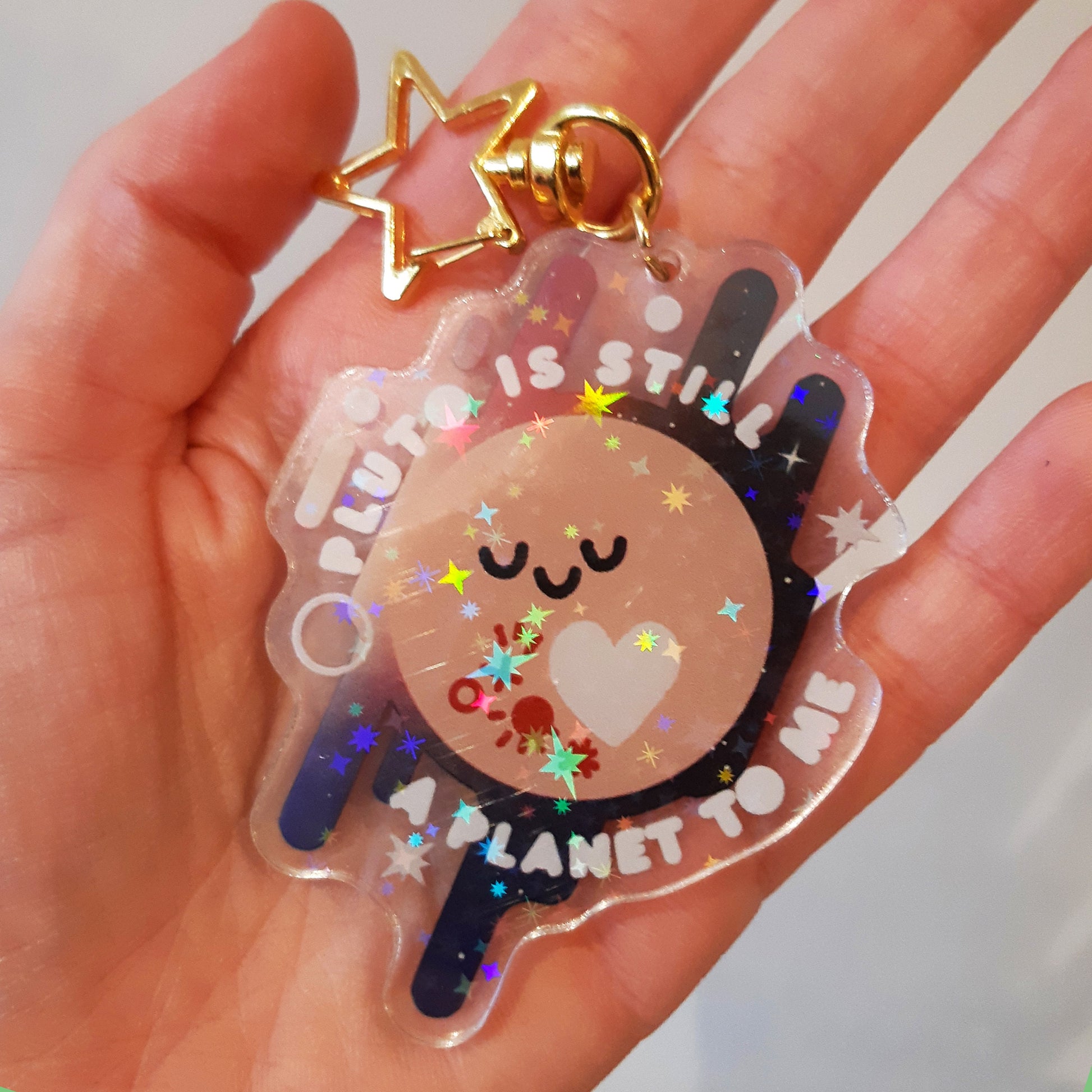 7 x 5.5 cm "Pluto is still a Planet to me" Acrylic Holographic Key Charm - Clear Plastic with Rainbow Holographic Stars featuring the planet Pluto.